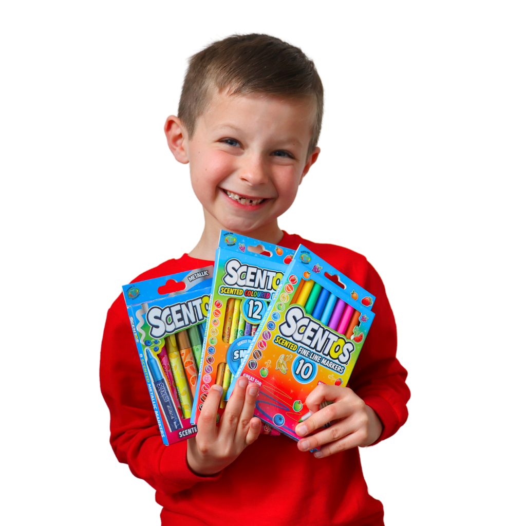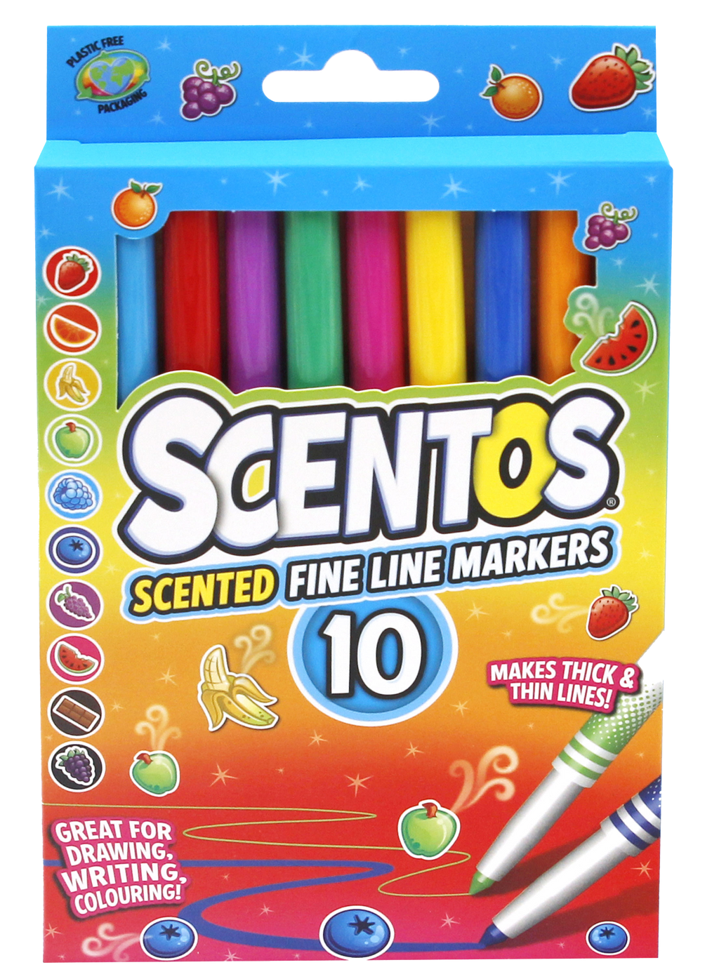 10 scented fine line markers. Makes thick and thin lines. Great for drawing, writing and colouring. Includes 10 different colours and scents. Scents included: Strawberry, orange, banana, apple, blue rasperry, blueberry, grape, watermellon, chocolate and blackberry.