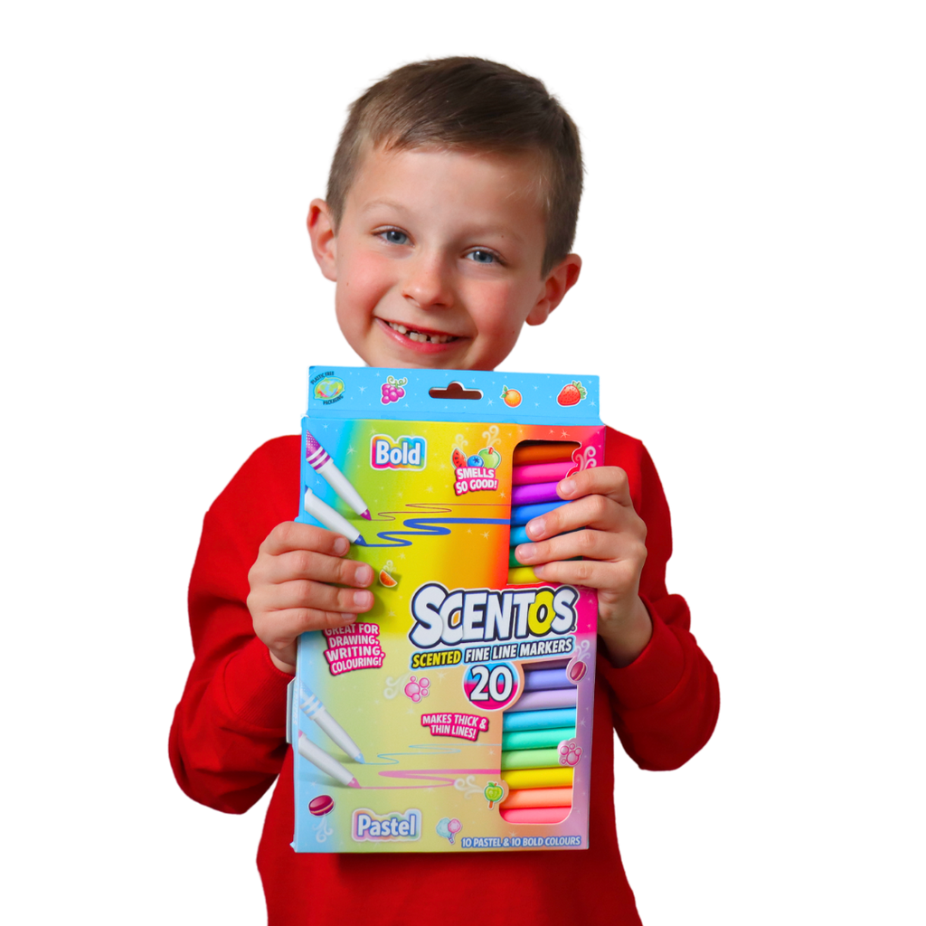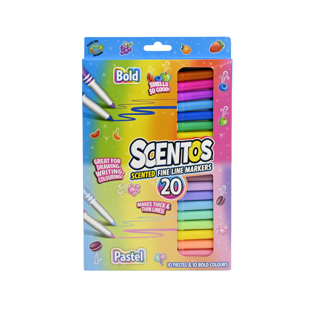 20 scented Pastel & Bold fine line markers. Makes thick and thin lines. Great for drawing, writing and colouring Includes 10 different colours and scents. Scents included: Strawberry, orange, banana, apple, blue rasperry, blueberry, grape, watermellon, chocolate and blackberry.