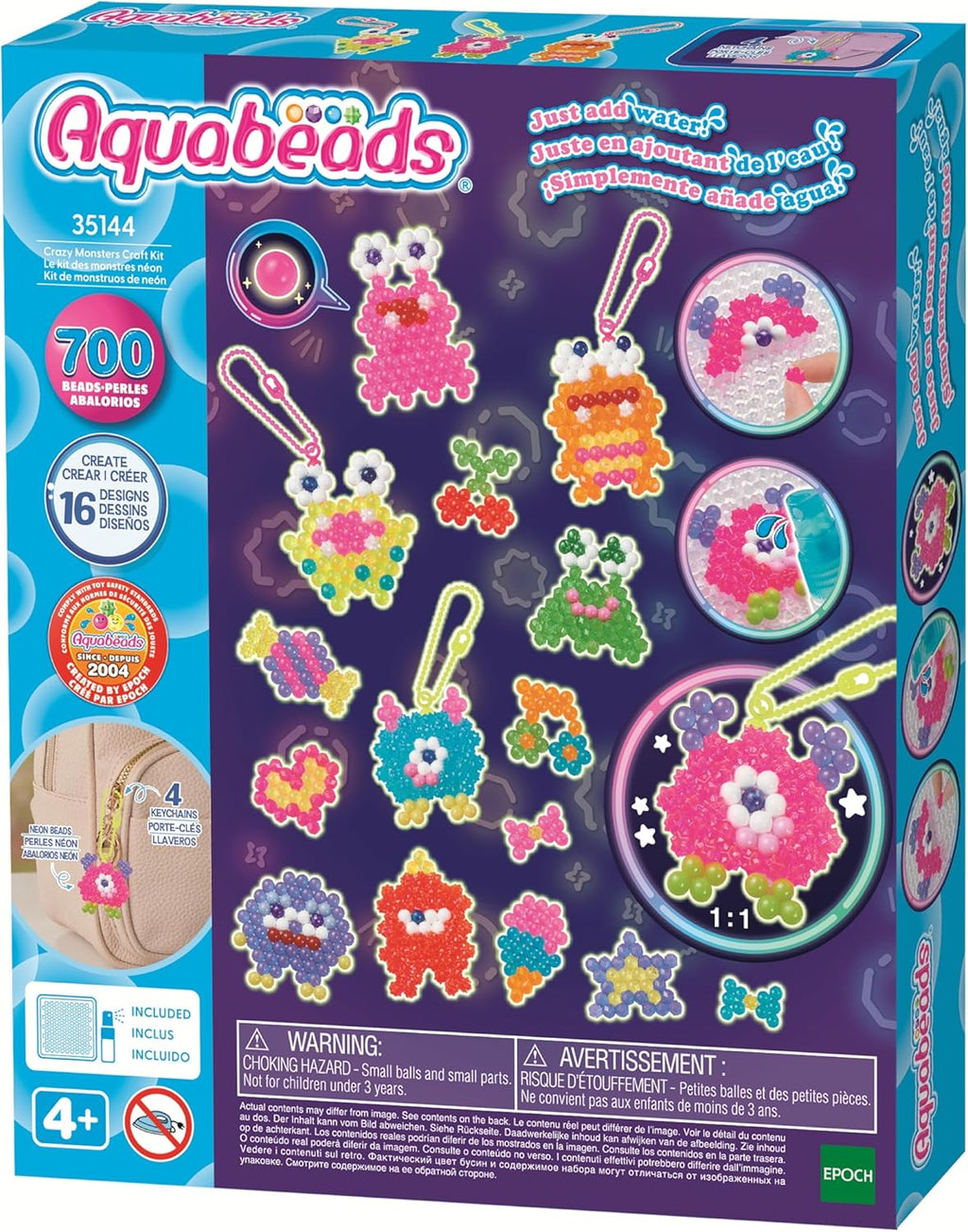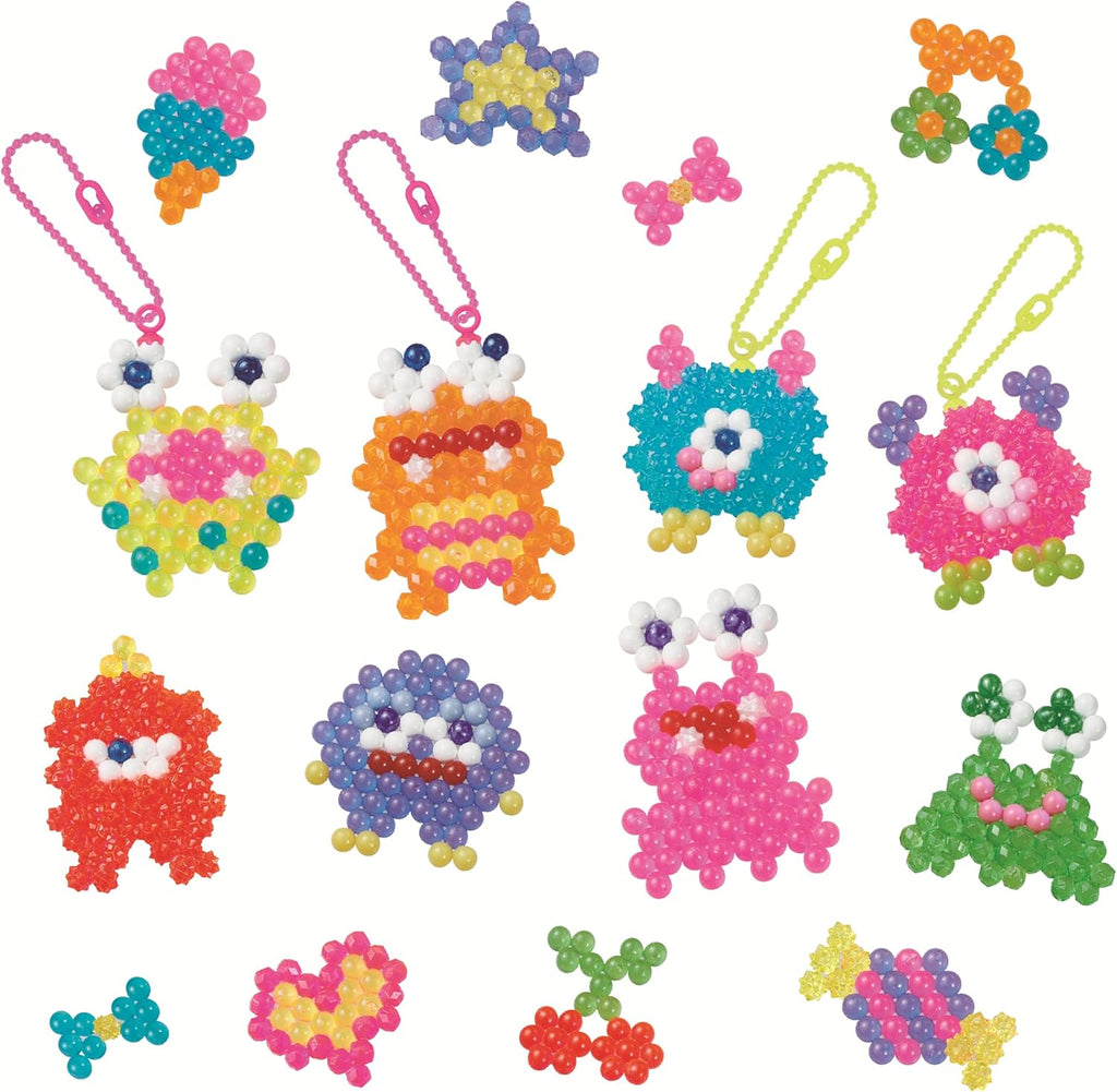 Aquabeads is the Original Water-Activated Bead Craft Kit! Since 2004, children throughout the world have created millions of Aquabeads designs. The Crazy Monsters Craft Kit includes 700 beads, layout tray, sprayer, keychain attachments, keychain straps, and template sheet with instructions. Following the template sheet, place the beads onto the tray to create neon colored monsters. Using the sprayer, spray water onto the beads to make them magically stick together! Includes 700 Classic beads, Polygon beads, and Star beads of 27 kinds including the vibrant neon colors, layout tray, sprayer, 4 sets of keychain attachment with keychain strap, and template sheet with instructions. For children ages 4 and up. Aquabeads was created by Epoch Co., Ltd. in 2004 as the original "stick with water" bead toy. Not suitable for children under age 3 due to small parts. Package size: 20 x 3.5 x 24 cm.
