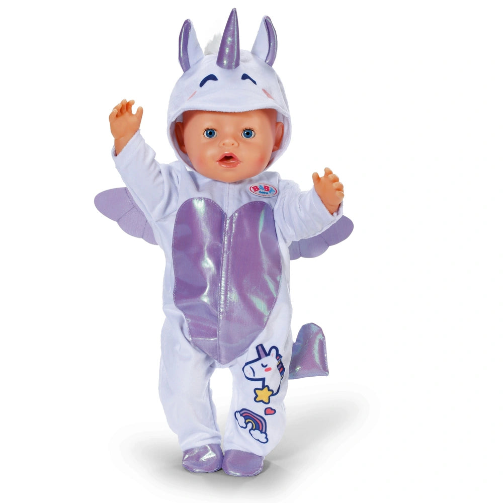 Let your BABY born doll shine in the adorable Baby born Unicorn Onesie! Made from soft, snuggly fabric, this magical outfit is perfect for dress-up fun, cosy cuddles, and adventures! The cute hood features little ears and a fluffy mane, while the shimmering unicorn horn, wings, and heart-shaped tail add a touch of fantasy.