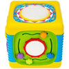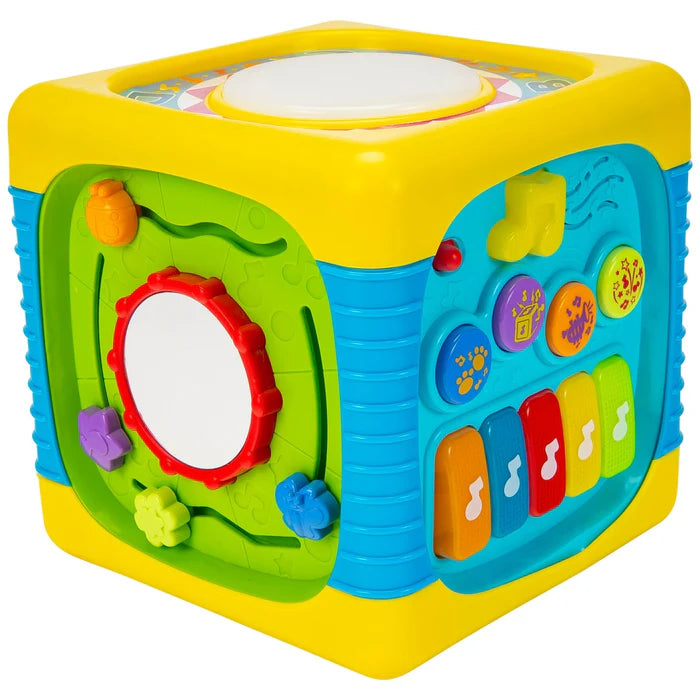 Explore music, shapes and more with the Big Steps Play Music Fun Activity Cube! This fun-filled activity cube features an activity on each side and a kid-safe mirror that’s perfect for self-discovery. Little musicians can play simple tunes on the 5 note light up keyboard or tap out their rhythm on the flashing drum pad. See the drum change colour as you play! Turn the gears to discover cause and effect, or wiggle the sliders for dexterity-boosting fun. The Big Steps Play Music Fun Activity Cube even features a 4-piece shape sorter. Slot the green heart, the yellow circle, the blue triangle and the purple square into their spaces to help kids learn about shapes and colours as they play. Creative Play Every toy is a storytelling opportunity, allowing children to develop self-expression and experiment with problem-solving. Make the sliders race, build stories around the shapes, and more! Sensory Development Children discover the world through play, exploring sounds with the drum and keyboard, responding to bright colours and learning to recognise shapes and other objects by touch. Motor Skills Playing with the Big Steps Play Music Fun Activity Cube can help children to develop gross and fine motor skills, including put and take skills and hand-eye coordination.