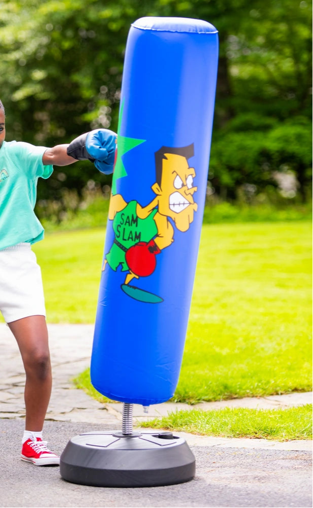 Kids can practice their boxing on this cool Inflatable Boxing Standand Gloves Set. It features a 150cm heavy duty punch bag and 8oz boxing gloves. Fill the base of your Boxing Stand with sand for stability. Boxing Stand and Gloves Set comes with a cool patterned design.