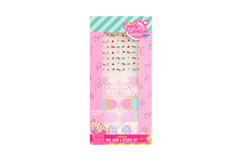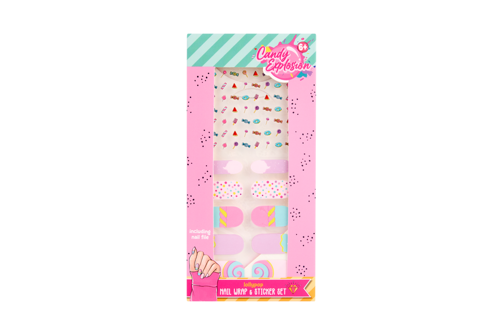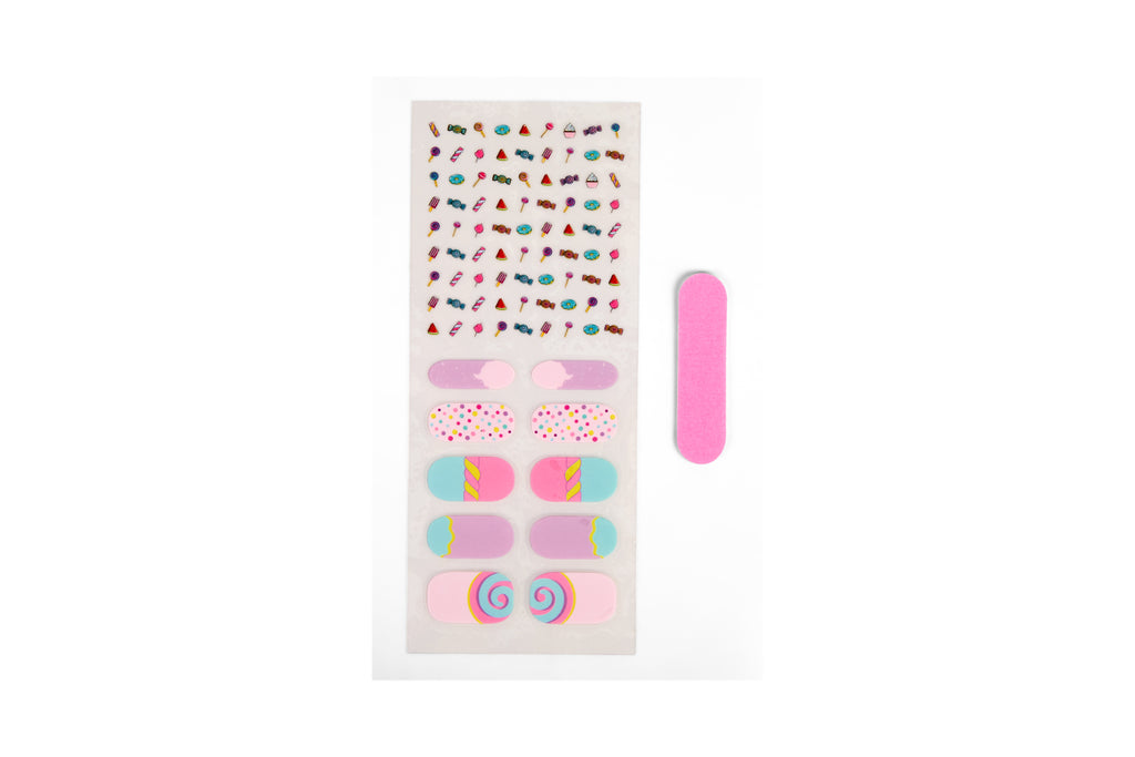 Create stunning sweet nails in just 1, 2, 3. The Candy Explosion Nail Wrap & Sticker Set is all you need to easily transform your nails into work of art. The 81 candy-themed nail stickers, 10 nail wraps and the pink file is made for creative, and colourful fun. Mix, match and glam up your nails in many different combinations. No need to polish your nails, as the wraps are easy to place on your nails. Gift it, share it, love it — this all-in-one nail art set is perfect for birthdays, sleepovers, or makeovers with your bestie!