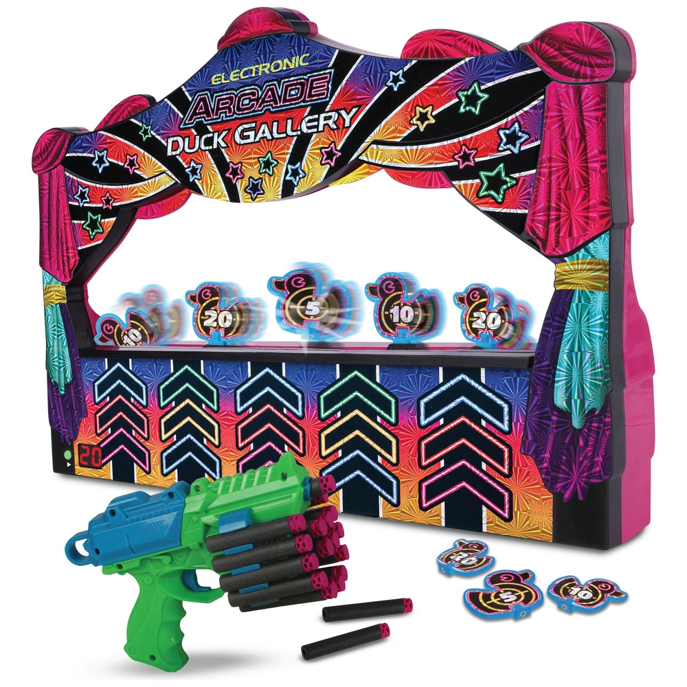 Step right up, step right up! Everybody's a winner in this fun and exciting edition of the classic duck gallery shooting game! Just like the carnival & arcade versions, the aim is to knock over as many ducks as you can in 60 seconds. Each duck turns around the stage along the moving conveyor belt, raising the challenge. The ducks also come in 3 sizes with various point values, so take aim at the smallest ones to improve your score! Carnival music and duck quacking sounds add to the atmosphere, while the bright LED timer lets you know how much time is left. Once you're done gather the ducks and tally up your score. Replace the ducks on the belt and you're ready to play again - everyone can take turns trying to set a record!