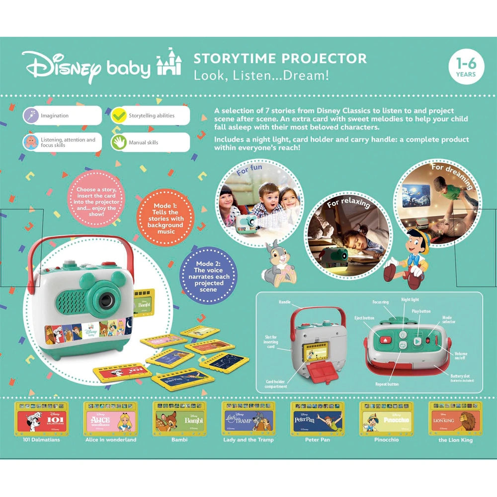 Rediscover classic Disney stories, Bambi, Pinocchio, Peter Pan, Lady and the Tramp, Alice in Wonderland, 101 Dalmatians and The Lion King! With high-quality audio, 2 volume controls, an adjustable focus projection, a built-in nightlight and a convenient handle, each story is summarised in 8 easy-to-follow slides to make bedtime simple.