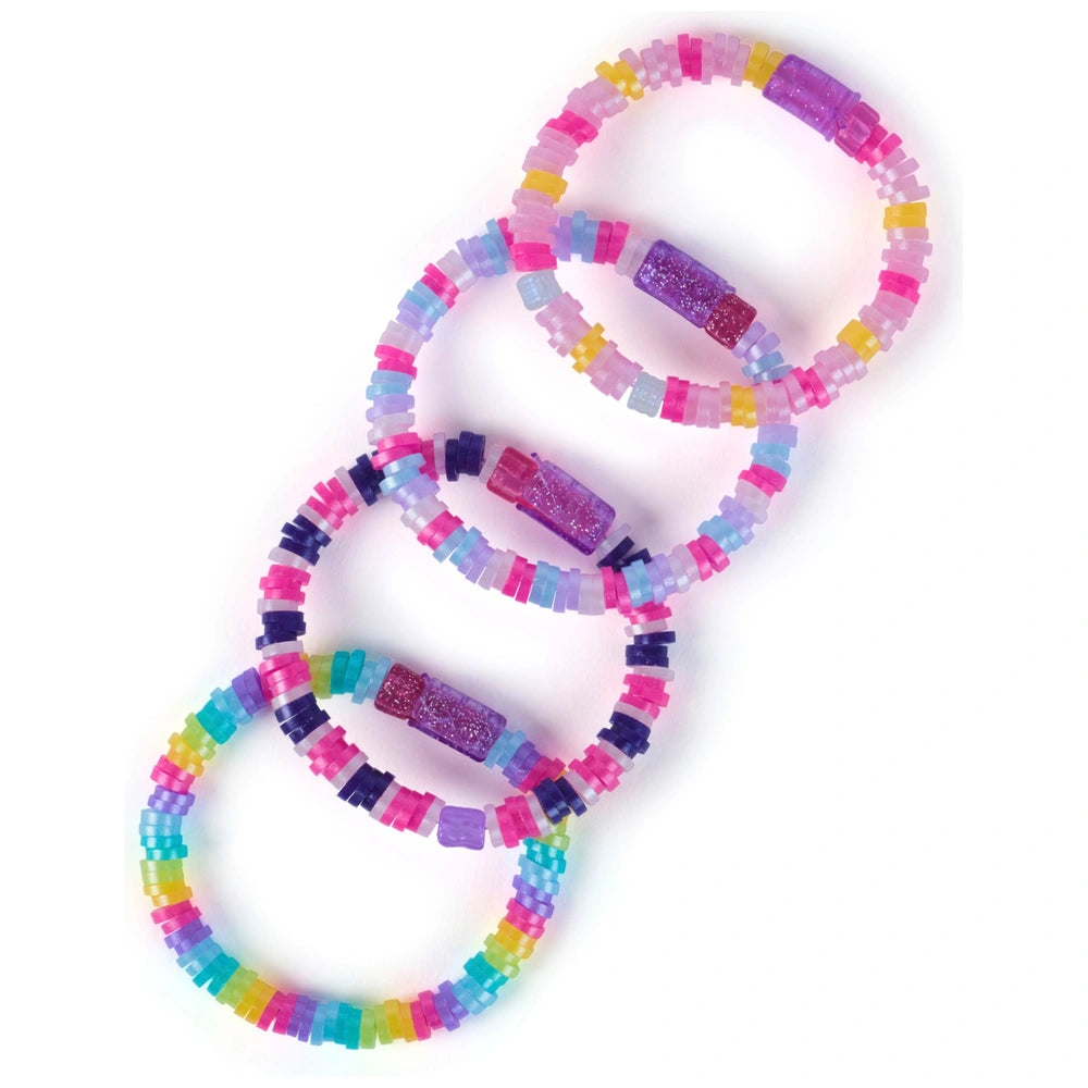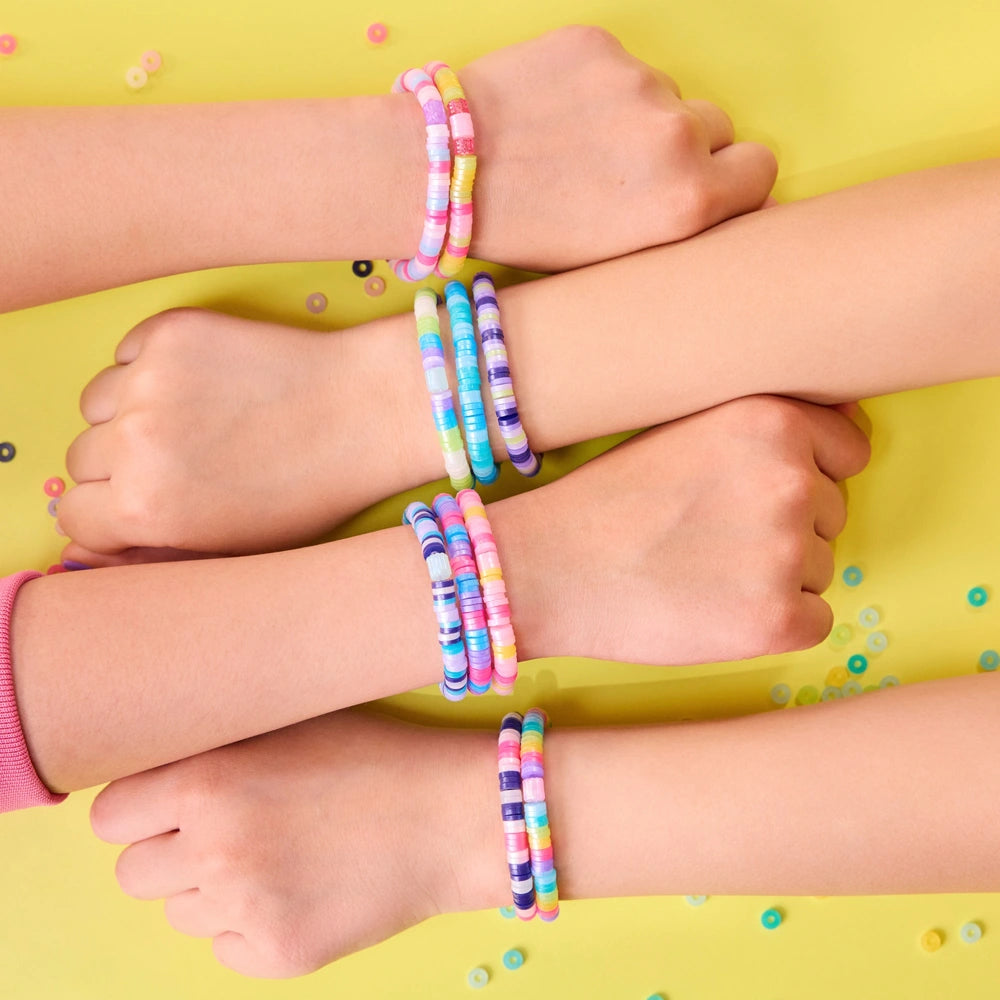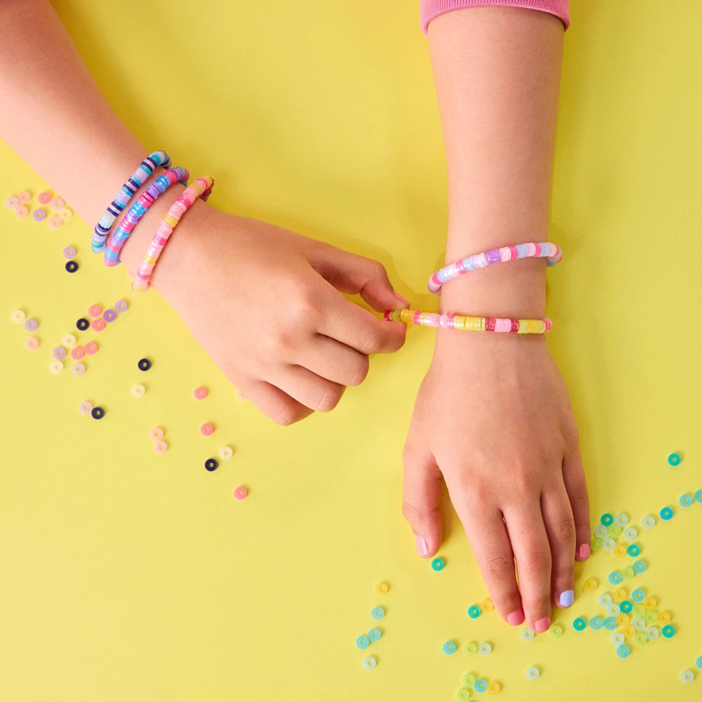 Kids can easily find their wrist size using the studios measuring guide, matching the symbol with the one on the studio's beading pen to make the right size bracelet. Pick up beads with the pen and watch the design stack inside, then release the beads in the studio, right onto the string. Slide the wrist through the studio and press the button to make the bracelet magically clasp together. Whether you're looking for engaging kids' activities for sleepovers, parties, back-to-school, rainy days or for every day, the Stack'd Heishi Expansion Pack is a welcome addition to your DIY jewelry making supplies, craft supplies and craft kits. Contents: 1300x heishi beads, 40x feature beads, 18x strings and 17x clasps (in 2 parts).