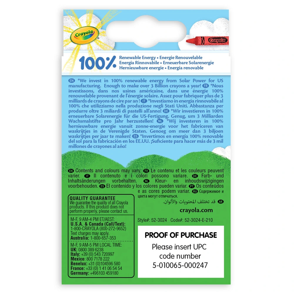 24 high quality wax crayons that give a smooth colour lay down with no uneven build up or streaking. Plus the crayons are doubled wrapped for extra strength, providing hours of creative fun. For ages 3 years and over.