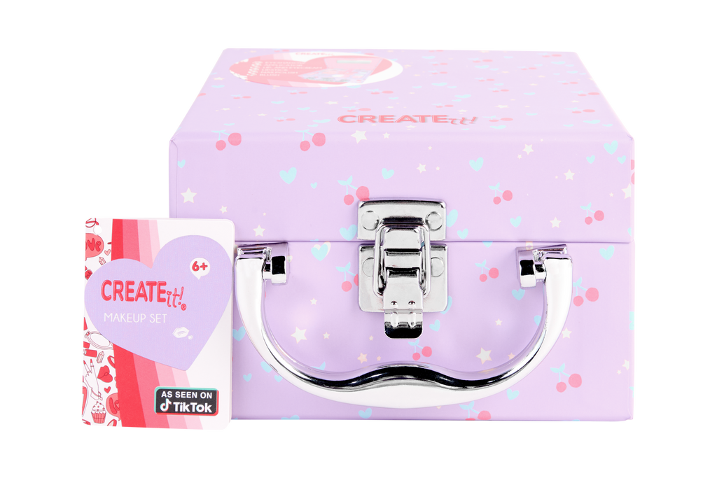 The perfect case to take your makeup and jewellery with you wherever you go is part of Create it. The storage space underneath the makeup provides perfect space for additional makeup and jewellery. Take the case with you to a sweet sleepover to give your friends a makeover, or on holidays. The makeup will stay safe as the case will protect it. The set contains lip glosses, eye shadows, blushes, scented lipstick, nail polish, and brushes. The Create it! products are designed for children aged 6 and over. The nail polish is real, whereas you have to remove it with nail polish remover.