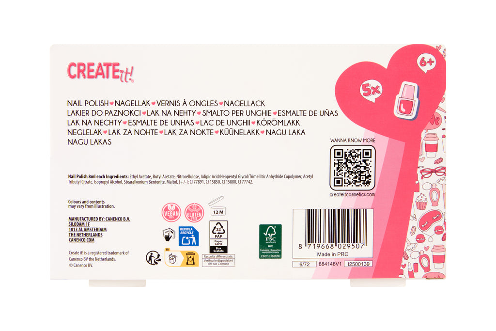 Each polish is safe for kids, easy to apply, removing the polish should be done with nail polish remover. Perfect for parties, playtime, or gifting. The Create it! products are designed for children aged 6 and over.