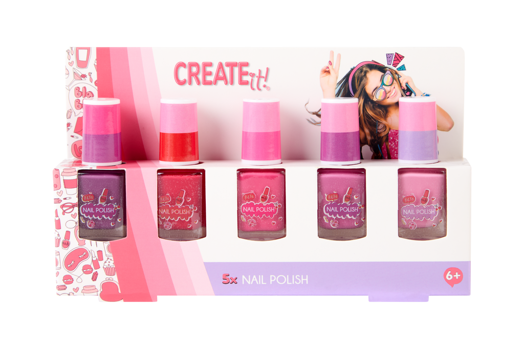 Never let your nails get out of style with the Create it! Nail Polish 5 Pack, with five vibrant shades to match — choose between pastel colours to match your style of the day — your nails will look amazing and make you shine through the day. Add a touch of colour to your daily style! Be bold, have fun, and let your fingertips shine as fabulous as can be!
