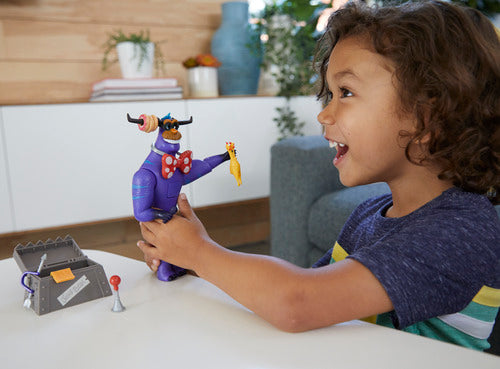 Live from Monstropolis, it's scare school graduate turned wannabe jokester Tylor Tuskmon! This detailed, posable interactive figure comes an attached microphone and 8 joke-worthy accessories. Press the button on Tylor's chest to raise the microphone to Tylor's mouth to initiate one of the 20+ child-friendly jokes; repeat the action for the punchline and sound effects. Good jokes get laughs, but there are clunkers, too, with matching responses! Kids will love interacting with this relatable character and his earnest efforts to be funny. Colours and decoration may vary.