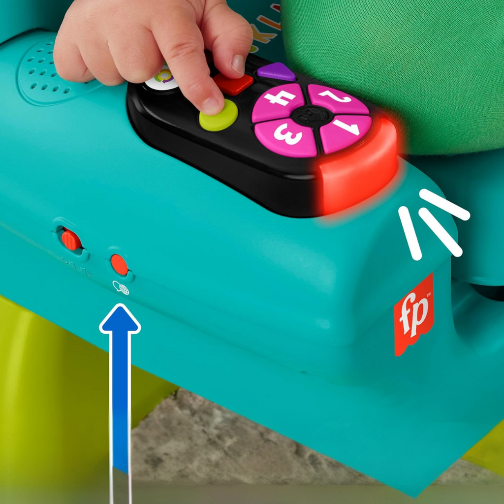 As they take a seat, babies and toddlers have lots of fun activities to explore, including a light-up pretend TV remote, a flipbook, and a lift-up seat cushion with hidden surprises!