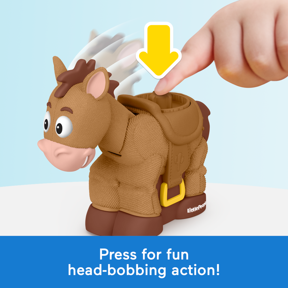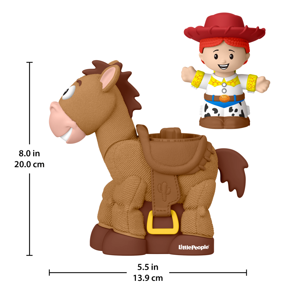Kids can gallop into exciting pretend play featuring characters from Disney & Pixar’s Toy Story films with this Little People Bobbin’ Bullseye & Jessie figure set from Fisher-Price! Inspired by the films, this figure set includes Jessie and her trusty horse, Bullseye, sized just right for small hands and featuring fun head-bobbing action. Kids can place the Jessie figure in the saddle for realistic horse-riding pretend play! Look for other Little People toys featuring Disney & Pixar’s Toy Story characters for more toddler-friendly storytelling fun. Little People figure set featuring Jessie and her horse, Bullseye, from Disney & Pixar’s Toy Story films for toddler-friendly pretend play. Head-bobbing action! Press the button on the horse’s back to see Bullseye bob his head up and down. Jessie figure fits in the saddle for realistic horse-riding play. Figures sized just right for small hands to grasp and move, helping to strengthen fine motor skills. These toys introduce the fun of cause & effect while encouraging imaginative storytelling play for toddlers and preschool kids ages 18 months and older .