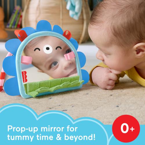 The Prop 'n Go Portable Mirror from Fisher-Price helps keep your newborn engaged in developmental play at home or wherever you go! This friendly hedgehog features a large self-discovery mirror and fun textures for little ones to discover, plus a high-contrast, black and white patterned panel to help boost your newborn’s visual skill development. The mirror folds flat and easily props up to encourage your baby to engage and explore during tummy time. A convenient link lets you attach the mirror to a stroller or bag for travel play. Cute hedgehog-themed newborn activity mirror for at-home tummy time or take-along travel play ?Large mirror and high-contrast, black and white patterned panel help foster baby’s visual skill development . Fun textures and fabric details for tactile sensory exploration. Folds flat for storage with convenient link that attaches to stroller or bag. This toy helps foster self-discovery, sensory skills, and fine motor skills for infants from birth and older Fisher-Price Prop 'n Go Portable Mirror Baby Tummy Time Sensory Activity Toy for Newborns