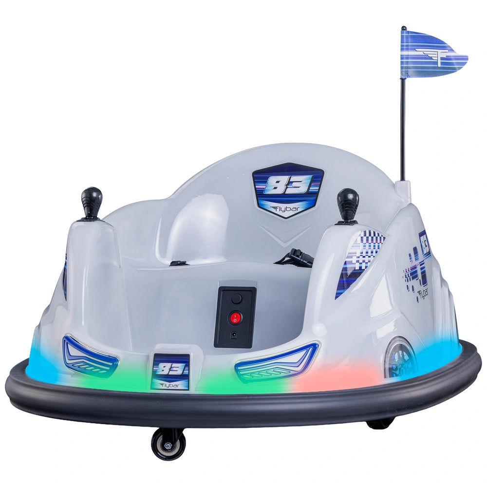 Get ready to race with the Flybar V2.5 Glow 10.8V Bumper Car! This stylish ride-on features LED headlights and taillights with 8 multi-colour light patterns, and dual joystick controls for 360° spinning action!