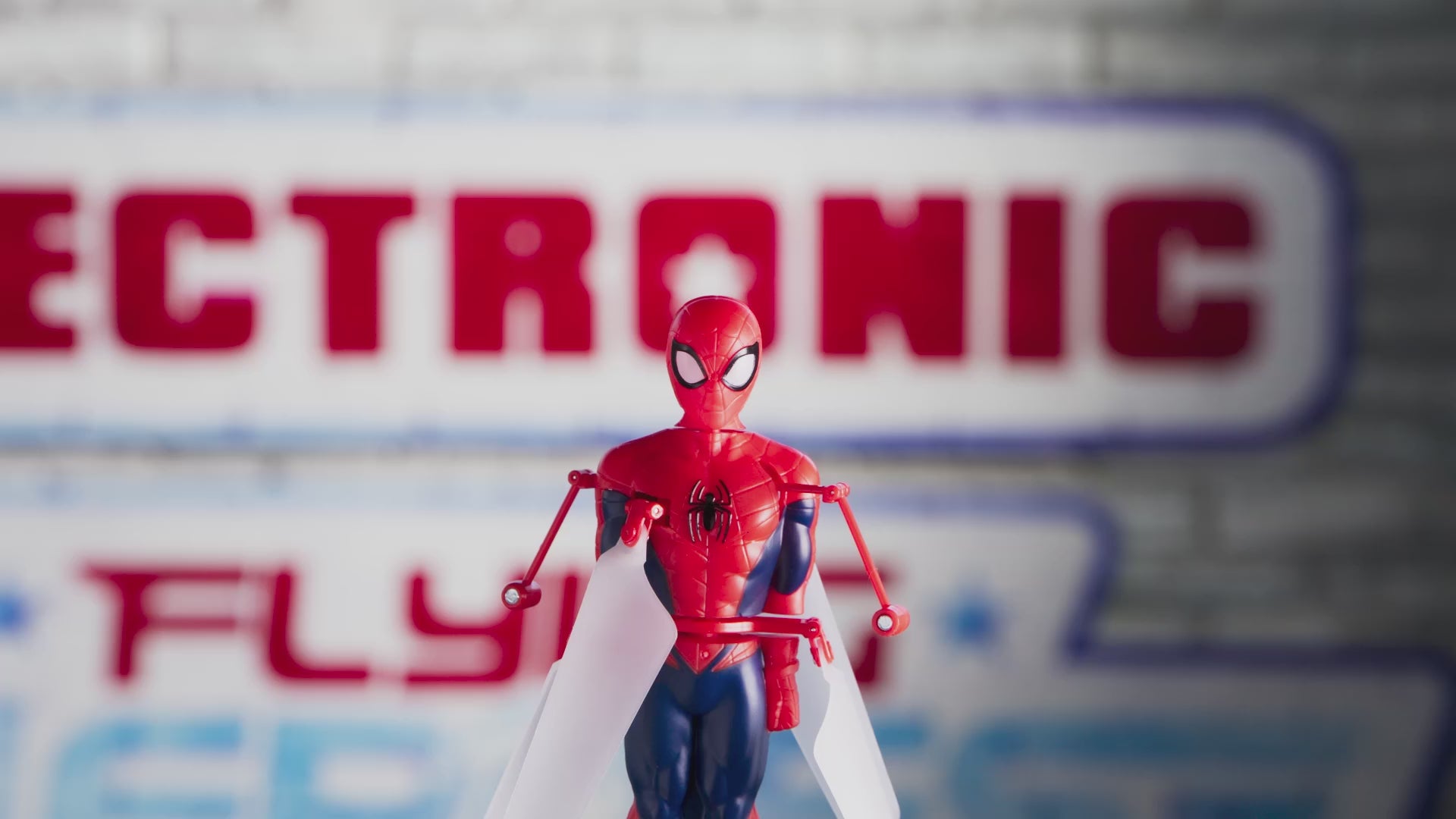 Experience epic action with Flying Heroes Hover n' Spin Spider-Man! Spider-man flies with 4 high-speed motorised propellers. Just tap his head for lift-off, then keep him in the air with your hand! Once Hover n' Spin Spider-man is flying, put your hand below him to control his direction, and guide him as he hover in the air! How long can you keep him flying? Flying Heroes Spider-man comes with a USB recharging cable, and a standing base to display him until he's ready to launch!