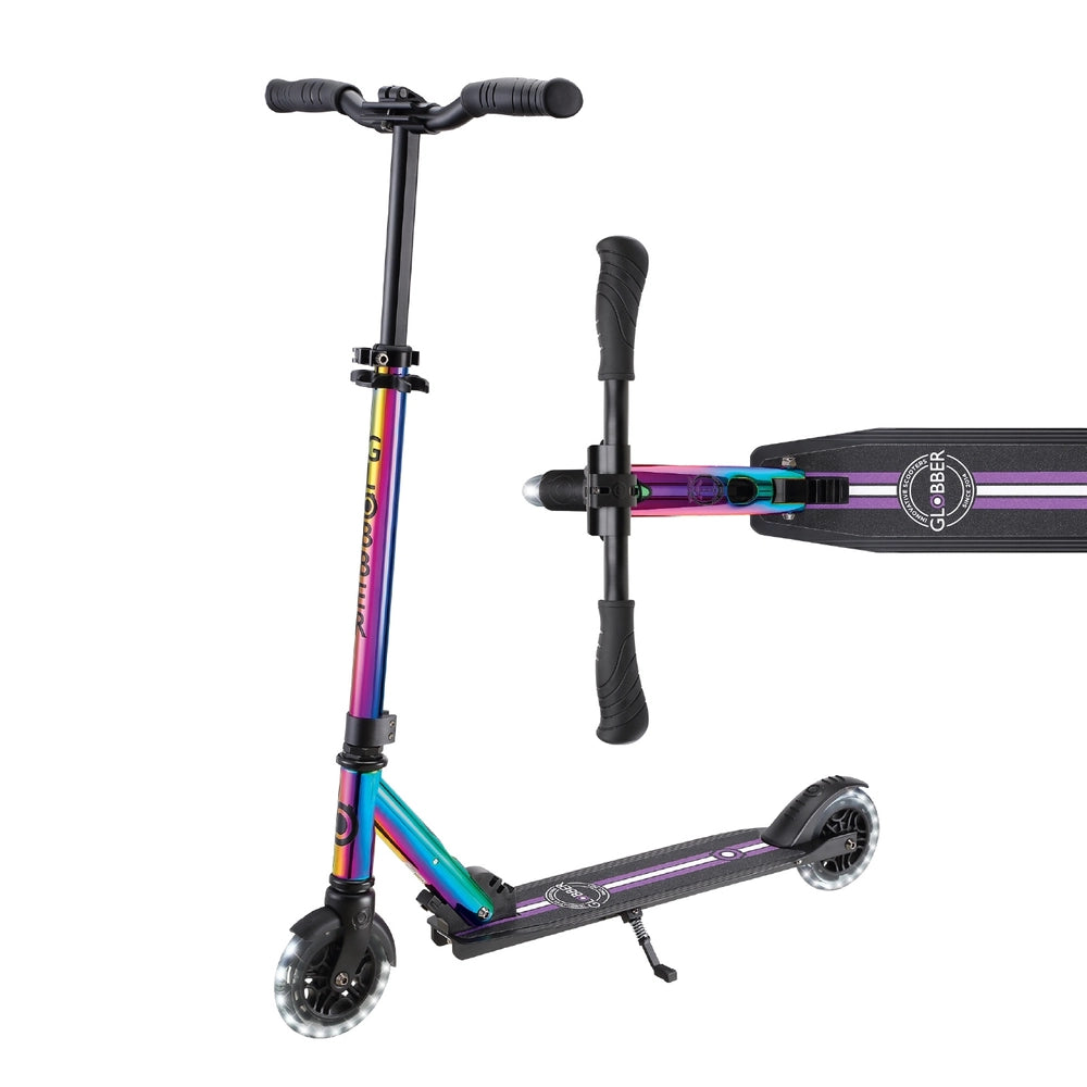 Globber's Flow Element Lights Neochrome 2-wheel foldable scooter comes with a fast, easy and secure patented folding system located on the downtube, allowing you to effortlessly fold it up. Just push the lock button located at the bottom of the downtube to put the it into folded mode, making it super easy to carry and store away!
