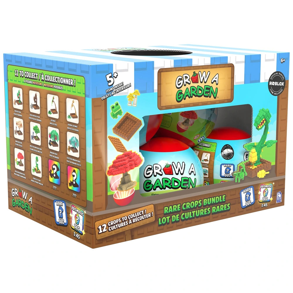 Grow your perfect crop collection with the Grow A Garden Rare Crops Bundle Series 1 Capsule, inspired by the colourful fruits, plants, and pets found across the games lively world. Each mini mystery sphere offers a fun surprise unboxing filled with garden-building pieces, including a planting plot, crops, and a companion pet so you can create and display your own miniature garden scene.