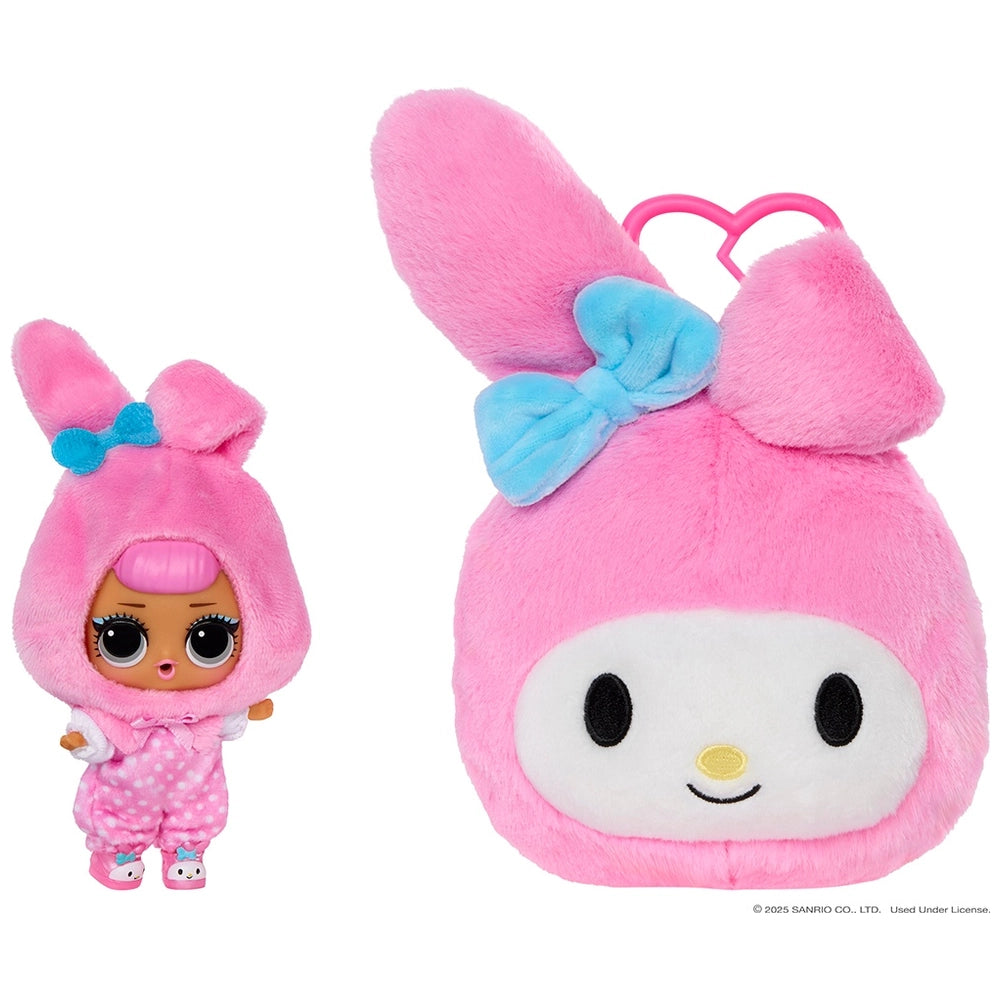 Contents: x1 reversible Sanrio plush, x1 L.O.L. Surprise Tot Doll, x1 fashions, x1 pair of shoes, x1 collectible keychain, x1 removable pink heart keychain.
