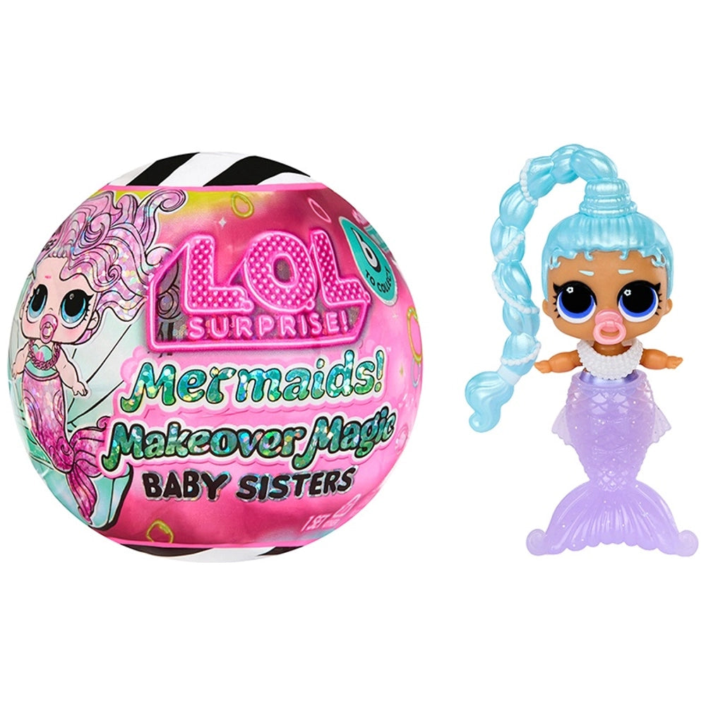 Contents: x1 shell-shaped capsule, x1 L.O.L. Surprise! Mermaids Makeover Magic Baby Sister doll, x1 mermaid tail, x1 doll accessory, x1 doll stand