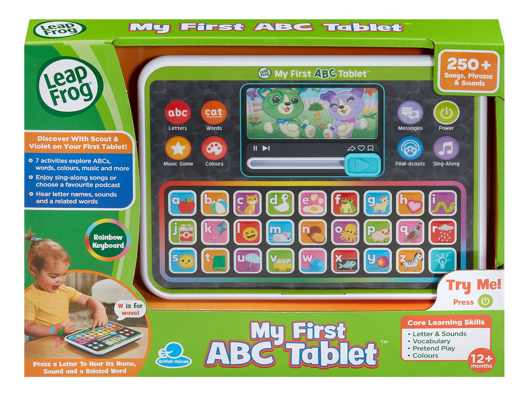 Discover endless learning fun with the My First ABC Tablet! With 26 interactive letter keys, little learners can explore the alphabet, colours, and animals while building early recognition skills. Four exciting learning modes introduce letters and their sounds, numbers, animal names, sounds, and fun facts to make education engaging and playful. Press the three activity buttons to hear pretend messages from Scout and Violet, short and silly “paw-dcasts,” and cheerful songs. Move the slider to watch Scout and Violet come to life with interactive audio. Featuring a trendy backlit keyboard with two glowing patterns, this cool toy makes learning magical! 26 Interactive Keys: Introduces the alphabet, colours, and animals to build early recognition skills. 4 Learning Modes: Explore letters, sounds, numbers, animal names, and fun facts through engaging play