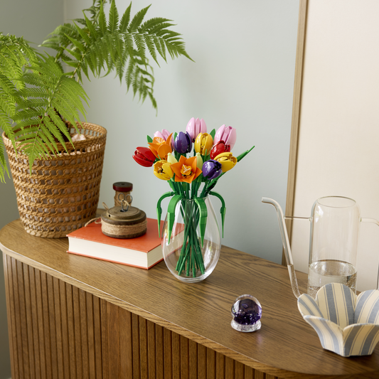 A thoughtful gift for women and men on birthdays, Valentine’s Day, Mother’s Day, housewarmings or any other special occasions, this flower building set is available in the LEGO Builder app, where budding florists can access digital building instructions and track their progress. Set contains 576 pieces. Let creativity flourish with a LEGO® flower decor building kit for adults. The bouquet includes 5 varieties of tulip in various colours and stages of bloom. Adjustable stems encourage budding florists to create a bespoke bouquet. Once complete, the tulip bouquet becomes a piece of floral home decor. A great flower gift for women and men on birthdays and special occasions. Zoom, rotate and build together in the LEGO® Builder app. Explore other sets (sold separately) in the LEGO® Botanicals collection. The tallest tulip in the 576-piece set measures over 36 cm (14 in.) high.