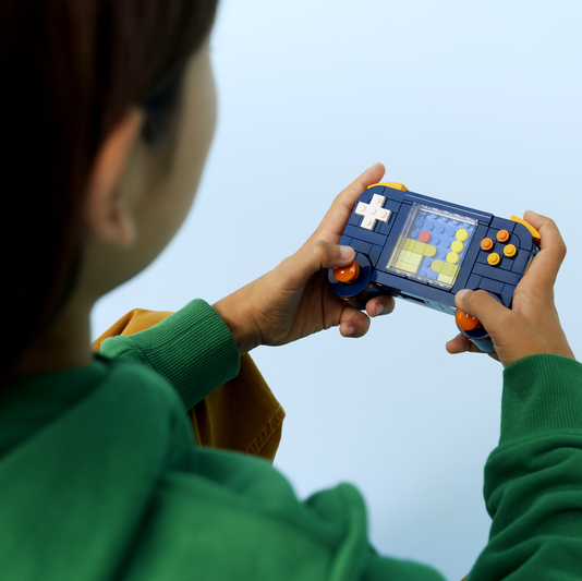 Boys and girls can choose to build a handheld gaming console toy with 2 moving joysticks and 2 moving buttons, plus a choice of 3 games cartridges to insert into it. This can then be rebuilt into a desktop mini computer, which includes a keyboard and monitor, a disk to place inside and a mouse, or an arcade game machine.