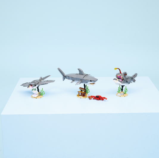 They can choose to build a posable shark toy that can be displayed on a stand with a treasure chest and crab. They can then rebuild it into an anglerfish on a stand with sea plants or a posable manta ray toy on a stand with a clamshell. Once the building and playtime fun is over, each model can be displayed as room decor on a shelf or desk.
