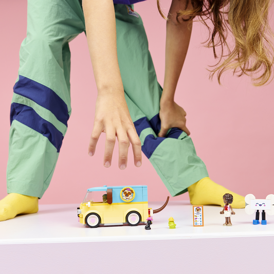 The detailed building set encourages open-ended play with 2 minidolls, kitten, dog and frog animal figures and cute pet accessories. This set is full of fun moments – admire the pug-shaped van and see its tail wag as it drives along! Get creative helping the pets try on different headgear, including a rain hat, cowboy hat, top hat and flower crown. Check out the cute bone mascot, then load the van with the accessories, ready for the next adventure.