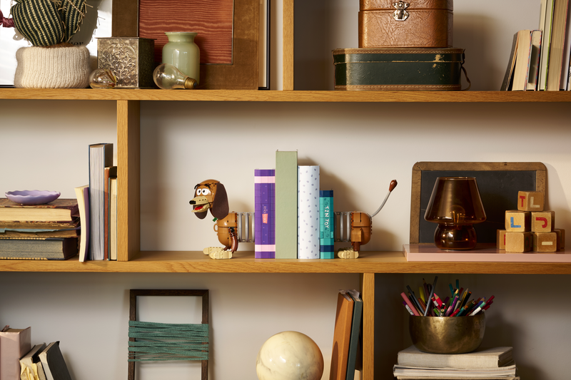 Share a love for Disney and Pixar movies and fantasy characters with this LEGO® | Disney and Pixar Toy Story Slinky Dog Bookends (43301) building set. This dachshund decoration, for adults and fans aged 18 and over, includes Slinky Dog with a turning head, fabric ears and movable paws, plus 2 books that attach to the dog or stand on their own. The books include a few Easter eggs: the small one has a spine function that reveals a Slinky Dog LEGO | Disney and Pixar character. The big one has 2 functions: turn a knob to reveal a Woody minifigure or remove part of the cover to peek inside and find more surprises.