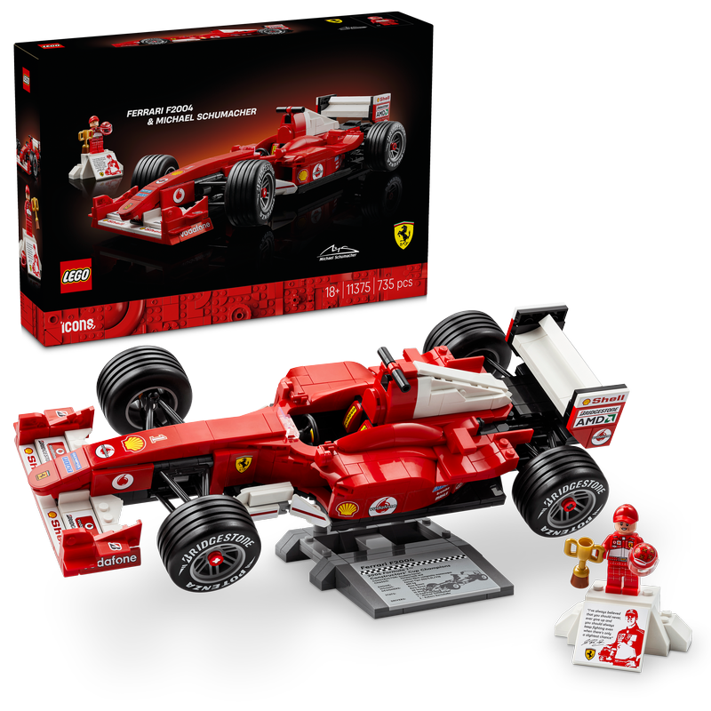 Celebrate a golden era of Formula 1 racing with the LEGO® Icons Ferrari F2004 & Michael Schumacher (11375) model car kit. Craft an in-scale replica of the legendary race car that, with Michael Schumacher at the wheel, dominated the 2004 racing season. The model Ferrari features working steering, grooved slick tyres and a detailed V10 engine, plus a display stand with vehicle details and stats. The Michael Schumacher minifigure comes with a helmet, winner’s trophy and a podium-style display stand with a printed image and a quote from the seven-time world champion.