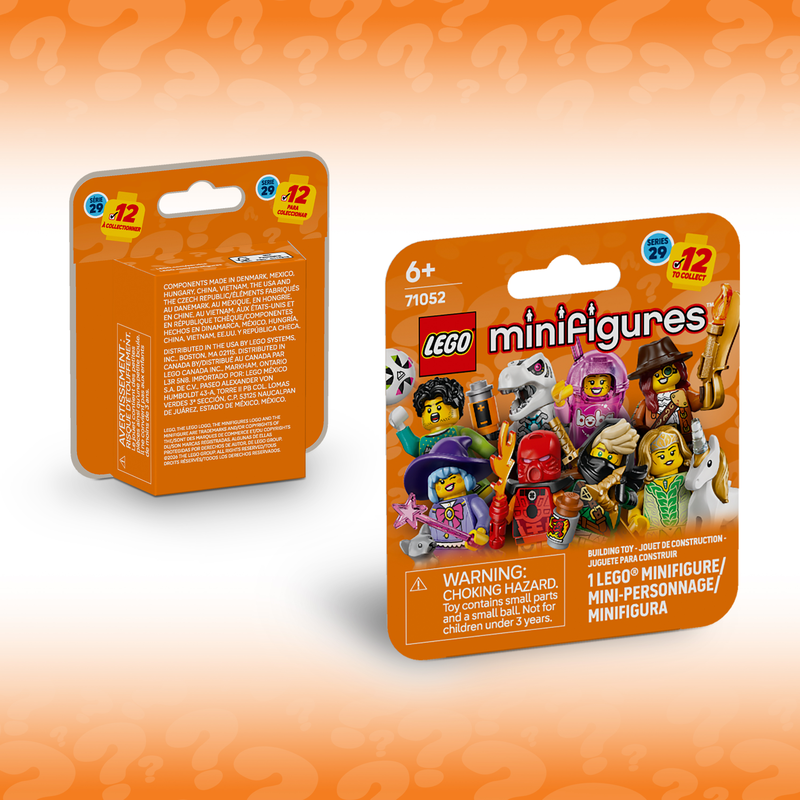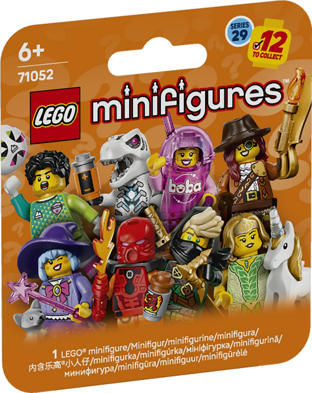 Excite a young builder and surprise them with 1 of 12 collectible characters from a LEGO® Minifigures Series 29 (71052) mystery box for boys and girls aged 6 and over. Each box contains 1 minifigure from a total of 12 small toys to collect: Foootball Goalkeeper, Marine Biologist, Tuba Player, Unicorn Elf, Monster Hunter, Robot T. rex, Chocolatier, Boba Cup Fan, Bionicle Cosplayer, Mysterious Ronin, Cute Witch and Trash Monster.