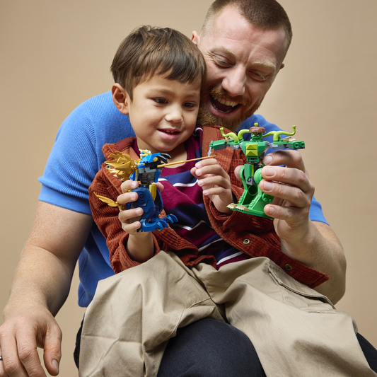 Jay’s dragon mech has an opening cockpit for his minifigure and posable tail, wings, arms, legs, body and fingers, while the Mutation Monster’s battle mech has an opening cockpit for his minifigure and posable tentacles, arms, legs and torso. The set also comes with 4 interchangeable weapons for enhanced play value: 2 swords, a spear and a set of claws.