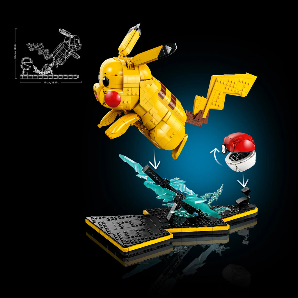 Enjoy enhanced building with the LEGO Builder app, zooming and rotating your build, while saving and tracking progress. This video game merch features a buildable model figure on a display stand. Move the ears and limbs to arrange the Pikachu figure into a dynamic battle pose. The LEGO® figure model kit comes with a lightning bolt display stand. This buildable Pokémon figure makes for a colourful piece of gaming room decor. A nostalgic gift for adult fans of Pokémon and gamers aged 18 and over. Make the creative experience extra fun with the LEGO® Builder app. This theme celebrates the collaboration of 2 beloved brands. 2,050-piece Pikachu gift standing over 35 cm (13.5 in.) tall.