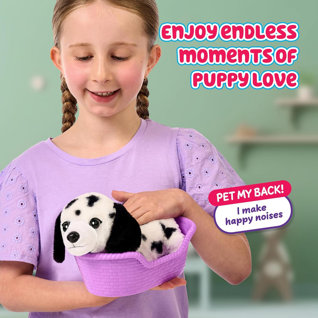 Get to know your puppy by gently patting on his back and watch him come to life with adorable puppy sounds. When its time to rest, tuck Pepper into his cozy puppy basket, until it’s time to play again!