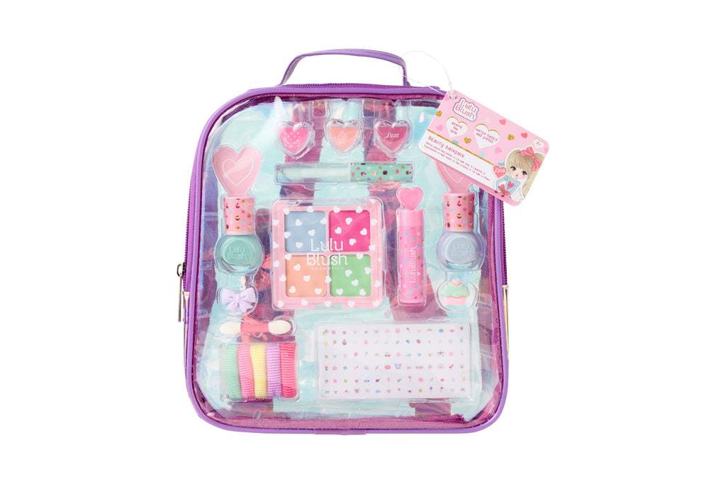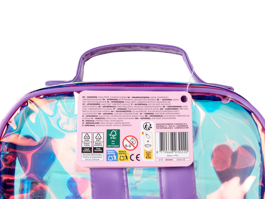 The Lulu Blush Makeup in Backpack is a transparant backpack with a holographic effect and purple edges. Lizzy is the Lulu girl on the front. Inside the bag, you’ll find 2 nail polishes (light blue, green), 3 pink lip balm rings (scents: raspberry, strawberry, and bubblegum), a pink raspberry lip balm, light blue apple lip gloss, eyeshadow with 4 colours (blue, purple, pink, green), a double-sided brush, five hairbands, 2 rings, and a nail sticker sheet. The backpack is 21 cm wide, 5 cm deep, and 22 cm high. Take your backpack wherever you go and become a true fashionista. The vegan formula isn't harmful for the skin, whereas the water based nail polish is safe for kids and easy to rinse of. Scan the QR code on the item and get to know more about the Lulu girls.