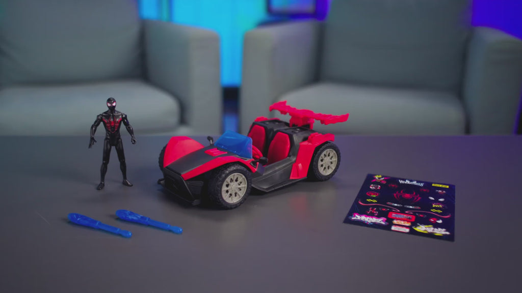 CUSTOMIZE WITH STICKERS: this collectible action figure and vehicle toy set comes with a Miles Morales-inspired sticker sheet, so boys and girls can customise the look of the Remix Blast Racer