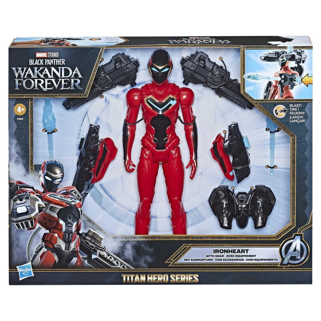 This 12-inch Ironheart action figure lets kids step into the world of Ironheart to help Shuri and the heroes of Wakanda save the world from new threats. This Ironheart superhero toy is part of the Titan Hero Series and is inspired by Marvel Studios' Black Panther Wakanda Forever movie. She comes with 5 pieces of snap-on gear and 2 blasting projectiles. Gear can be fired at just the push of a button and is perfect for defeating pretend enemies! All of the accessories connect to the figure and can be used to store the projectiles. Kids toys like Black Panther toys make great gifts for boys and girls ages 4 years old and up. A young, brilliant MIT student who has a passion for engineering, Riri Williams' life takes an unexpected turn when a school project brings the Wakandans and a dangerous foe to her doorstep. Collect action figures from the Titan Hero Series, inspired by the Marvel Universe. (Each sold separately. Subject to availability.)