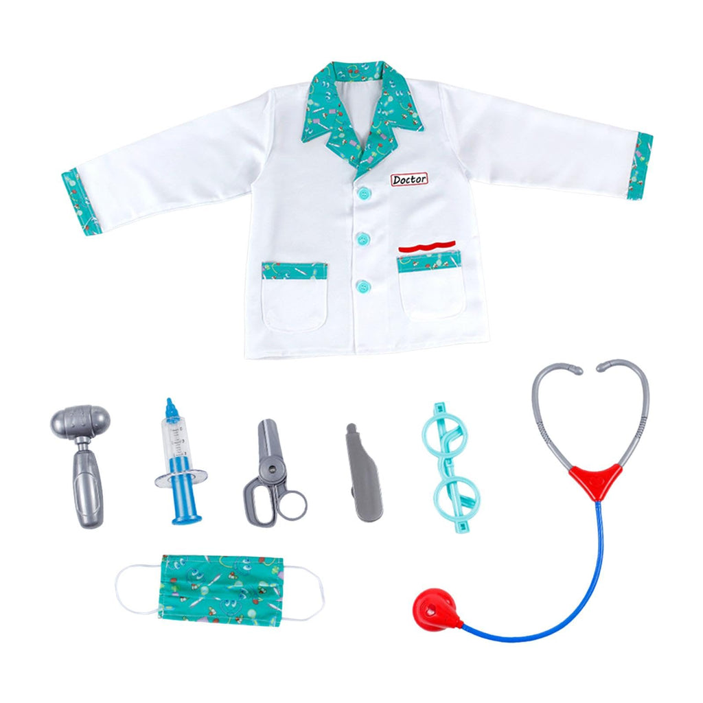 Contents: 1x jacket, 1x mask, 1x stethoscope, 1x reflex hammer, 1x ear scope, 1x syringe & 1x reusable name tag.