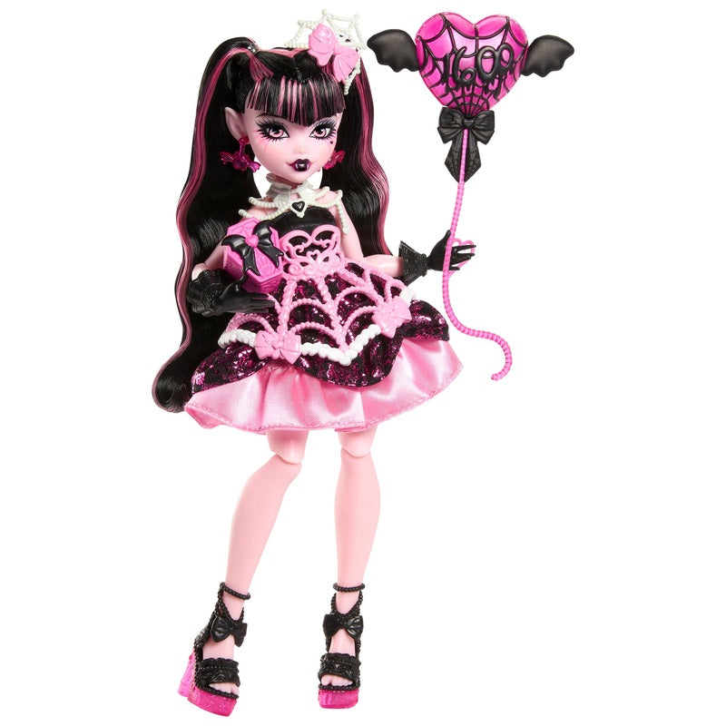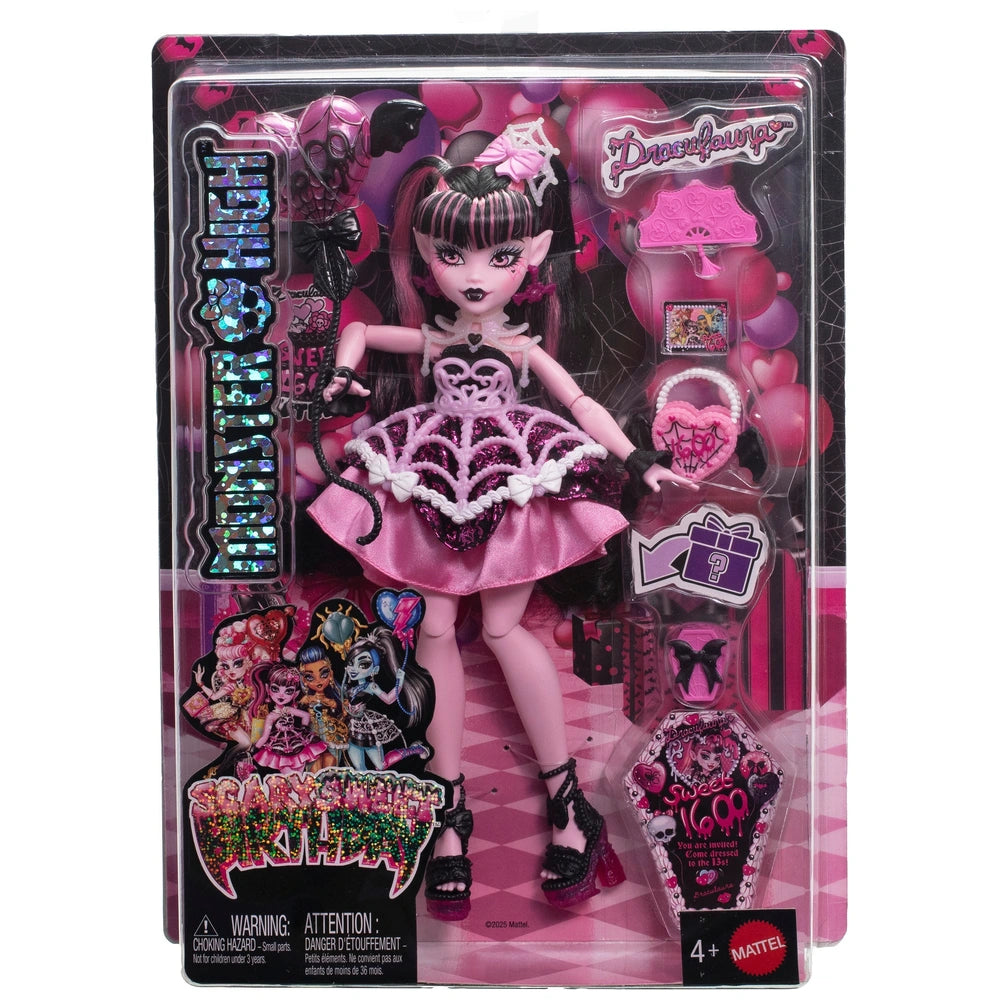 Contents: 1x Monster High Scary Sweet Birthday Draculaura Doll; 1x Invitation; 1x Balloon; 1x Birthday Card; 1x Bag; 1x Fan; 1x Pink Mug; 1x Gift Box