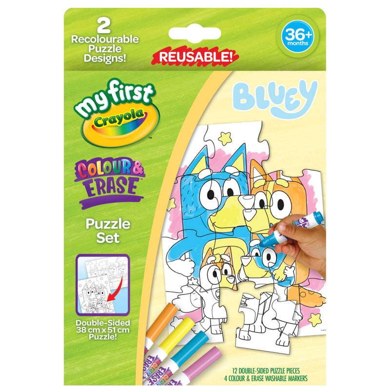 Keep your little ones busy with this My First Crayola Puzzle Set Colour & Erase Bluey! In this Bluey themed set, you will be able to colour in and put together a puzzle with all your favourite characters from the show. Double-sided too for longer play, you can wipe off the markers with a damp cloth and re-colour again and again. Perfect for on the go as the puzzle pieces aren't too small and can fit anywhere.