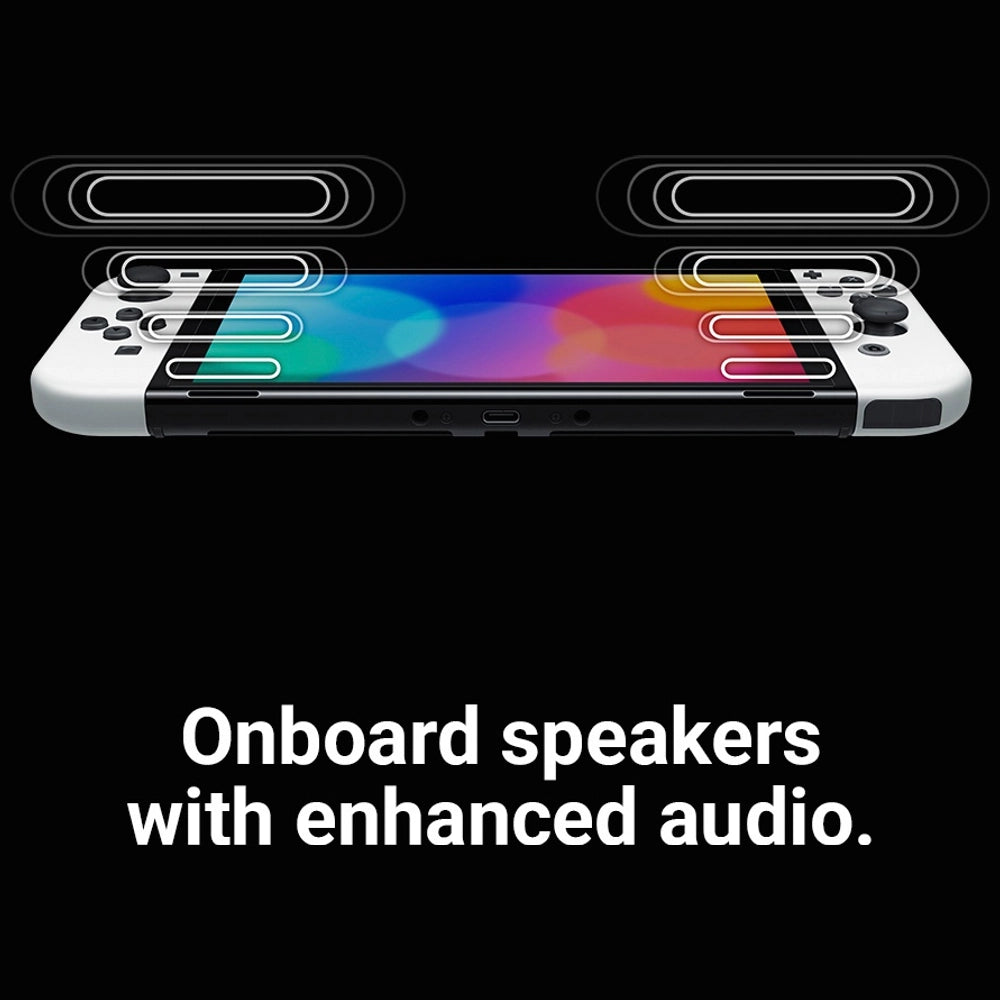 This switch features an enhanced vibrant 7-inch OLED screen, a wide adjustable stand, a dock with a wired LAN port, 64 GB of internal storage, and enhanced audio.