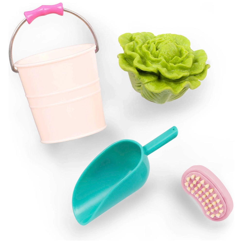 Contents: x1 Saddlebred horse, x1 saddle, x1 floral blanket, x1 bridle & reins, x1 scooper, x1 bucket, x1 lettuce, x1 grooming brush.