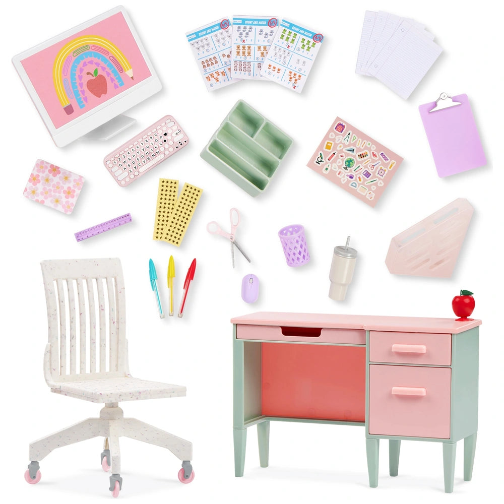 Take school day play to the next level with the Our Generation Class in Session doll desk set, specially crafted for 45cm doll teachers! Is everyone in attendance? Then it's time to start the fun! Kids can display the computer, keyboard, and mouse on the desktop to turn their play space into a modern classroom. Plus, the handy pullout drawers and drawer organiser keep supplies like pens, scissors, a ruler, and a set of loose-leaf paper within reach during the most engaging lessons. Adding to the joy is a bright red apple that sits cheerfully in the corner of the desk. And the peelable stickers let kids decorate for extra flair! Themed accessories like the water tumbler, file organiser, clipboard, and 3 exam sheets spark endless possibilities and inspire real-world learning. With its trendy pink design, this fully assembled desk is ready to pair with most 45cm dolls and school sets. Our Generation dolls sold separately. With its trendy pink design, this fully assembled desk is ready to pair with most 45cm dolls, school sets, and doll accessories. Use with posable Our Generation dolls for even more story-filled fun (sold separately). Contents: Teachers desk, rolling chair, drawer organizer, pretend computer, keyboard, mouse with pad, water tumbler, 3 pens with holder, scissors, a ruler, file organizer, clipboard, set of loose-leaf paper in a bag, 3 exam sheets, and 3 sticker sheets. Dimensions: 25.4L x 17.78W x 29.21H cm.