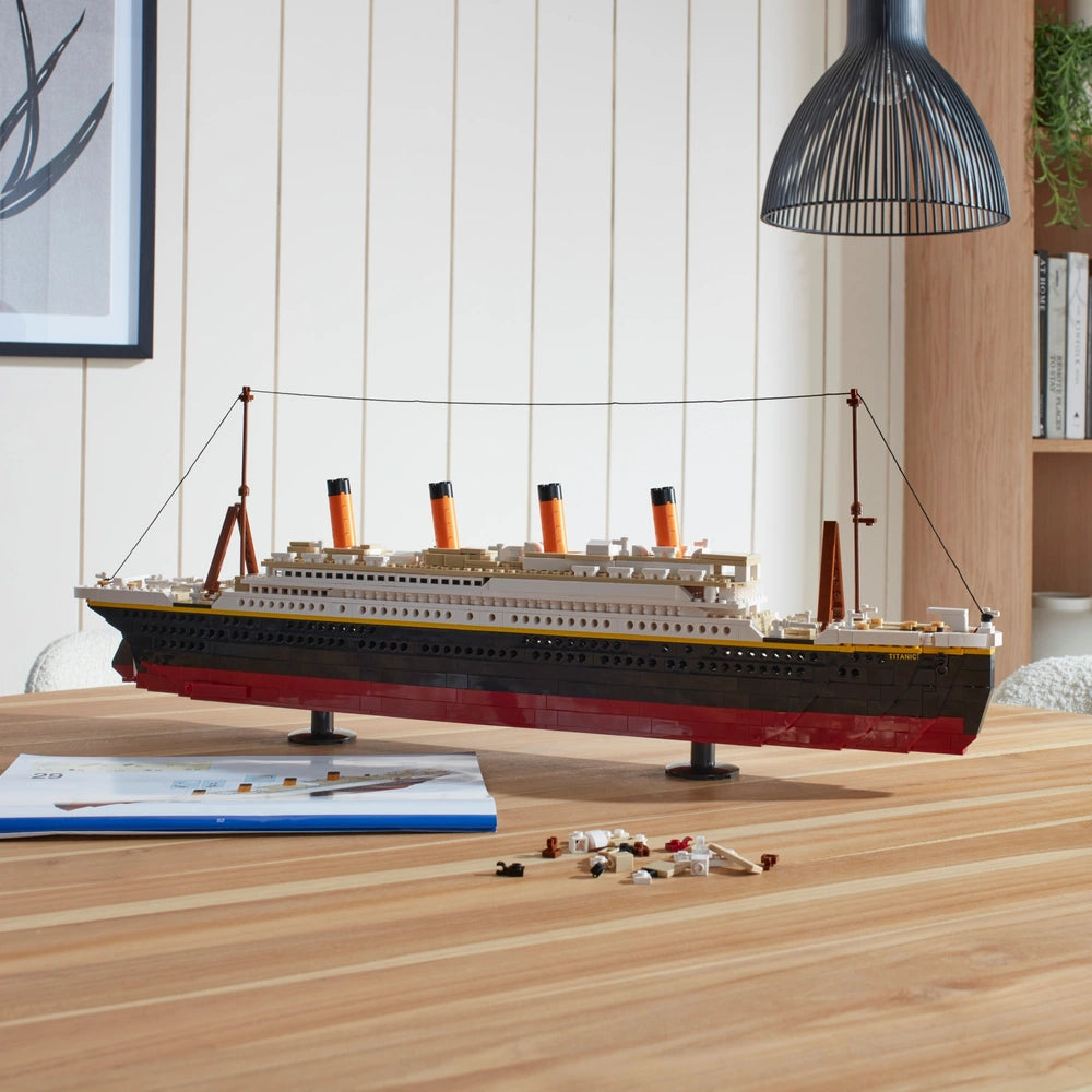 Build a beautiful replica of the iconic Titanic ship with the Build-It Titanic Set. This large-scale model of the Titanic features incredible detailing, from the funnels to the hull. Authentically styled in black and red with the legendary ship's name emblazoned on the prow, this brick-built building toy is sure to captivate model ship fans aged 8 and up.