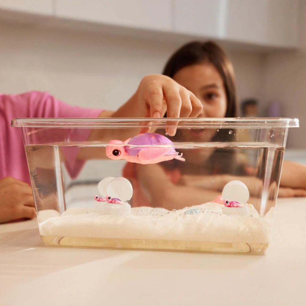 Simply fill the tank with water and watch as Mommy Turtle gracefully swims around, bringing her underwater world to life. Mommy Turtle doesn't just swim - she also loves to get out of the water and walk on land, just like a real turtle. Create a realistic habitat, and enjoy countless adventures with Mommy Turtle and her adorable family thanks to a resettable mechanism that means you can hatch her babies again and again. Contents: 1x Mommy Turtle, 1x Tank, 3x Eggs, 1x Sand Base and 1x Collector's Guide.