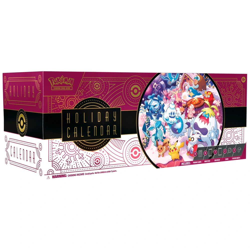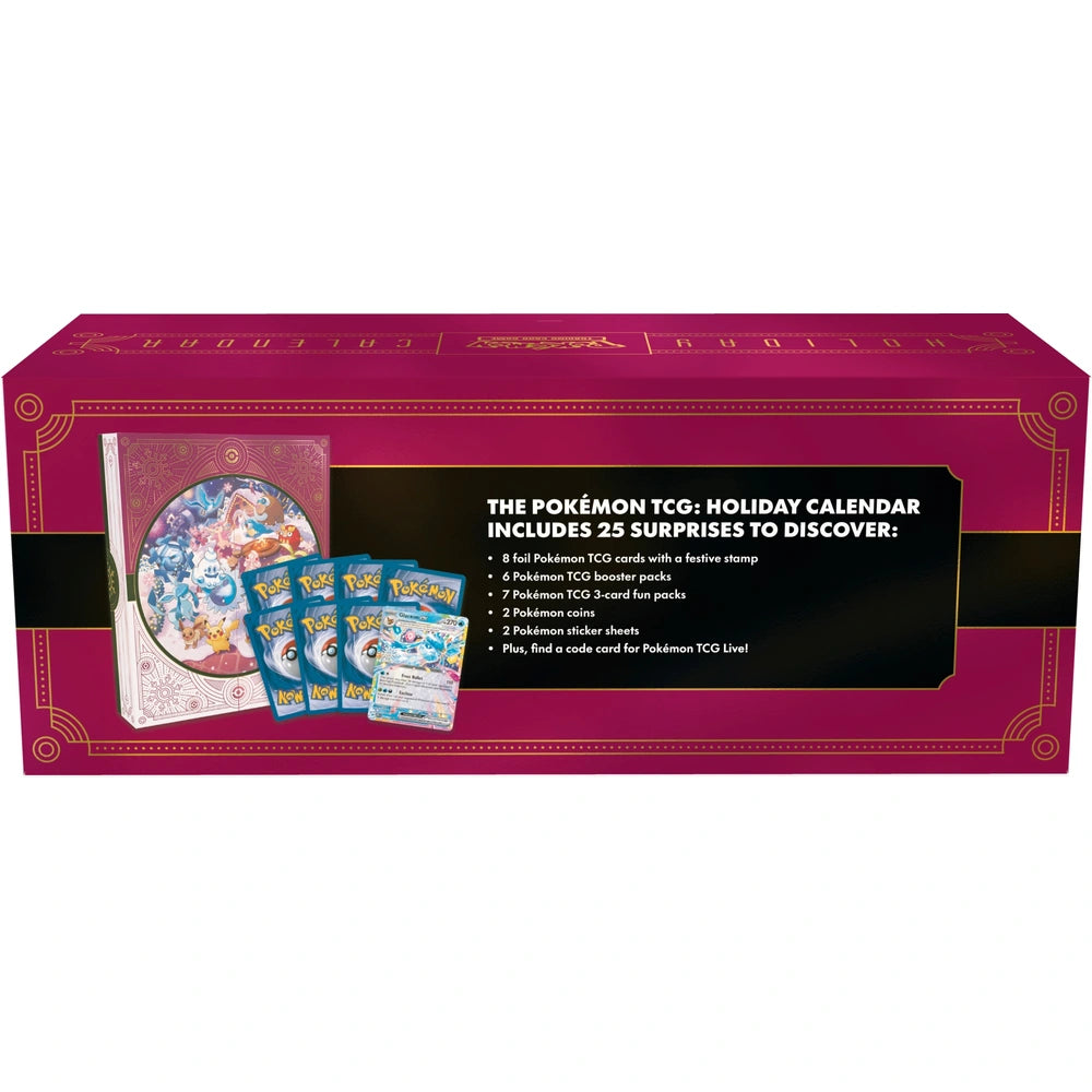 With a new surprise to reveal every day, countdown the holiday season with Pokémon TCG! Contents: 1x Pokémon Trading Card Game (TCG): Holiday Calendar 2025 (8x Pokémon TCG Foil cards with Festive Stamps, 6x Pokémon TCG Booster Packs, 7x Pokémon TCG 3-Card Fun Packs, 2x Pokémon Coins, 2x Pokémon Sticker Sheets, 1x Pokémon TCG Live Code Card)