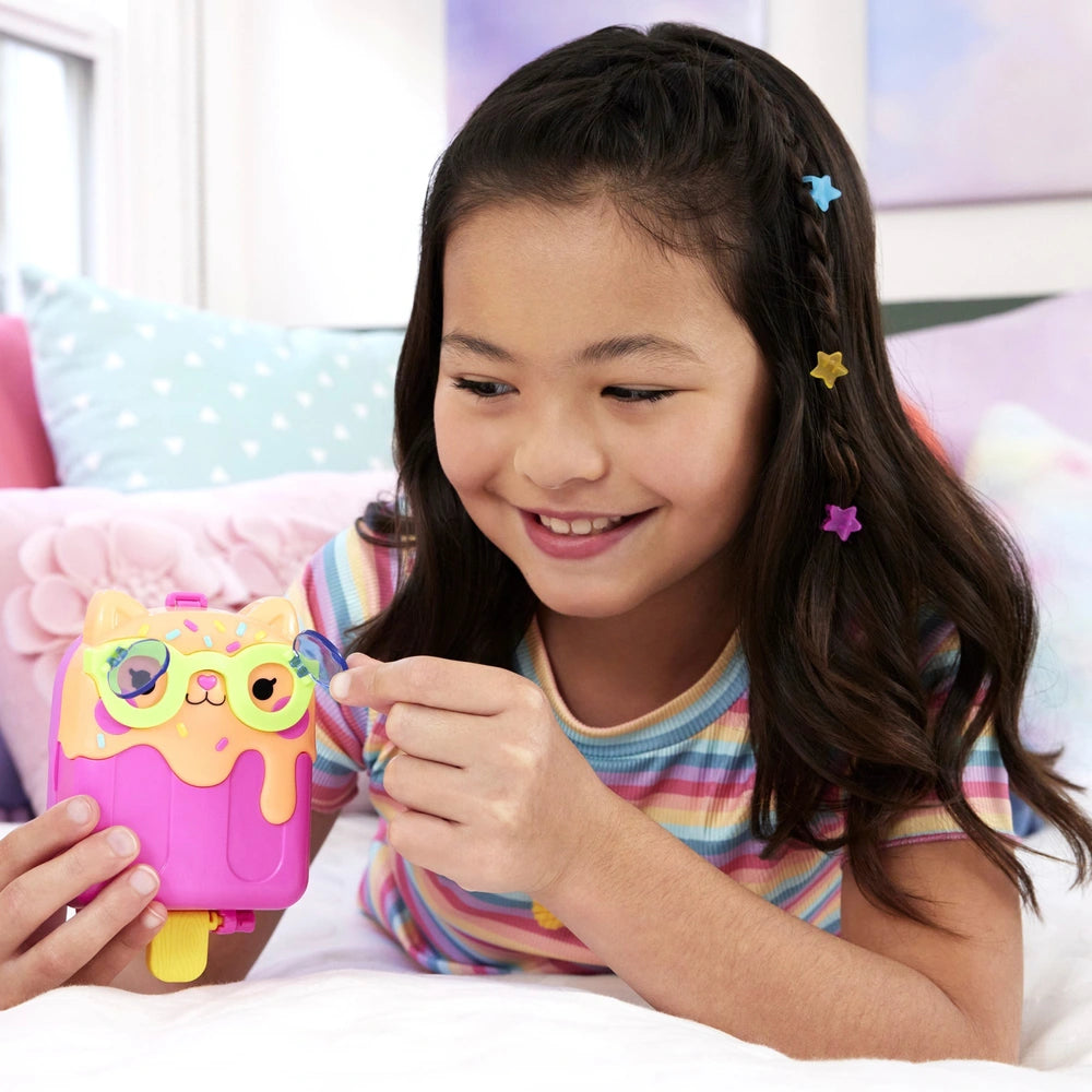 Get ready for a paws-itively fun getaway with the Polly Pocket Kitty Popsicle Resort Compact! Shaped like a kitty popsicle wearing cool flip-up sunglasses, this compact opens to reveal a tropical hotel scene bursting with playful details. It includes one micro doll, a pet puppy, and 11 themed accessories for imaginative vacation fun.