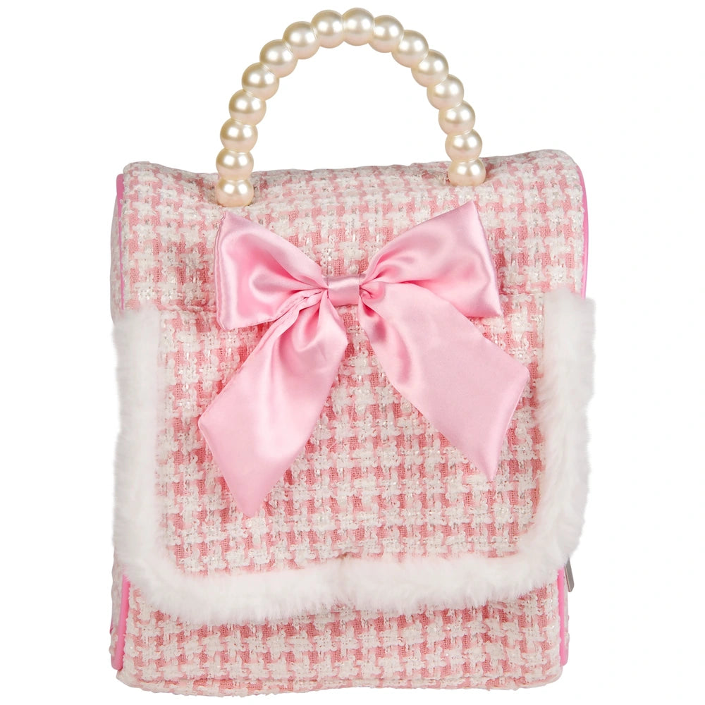 The tweed carry bag features pearl-like handles, satin bow and a faux fur trim