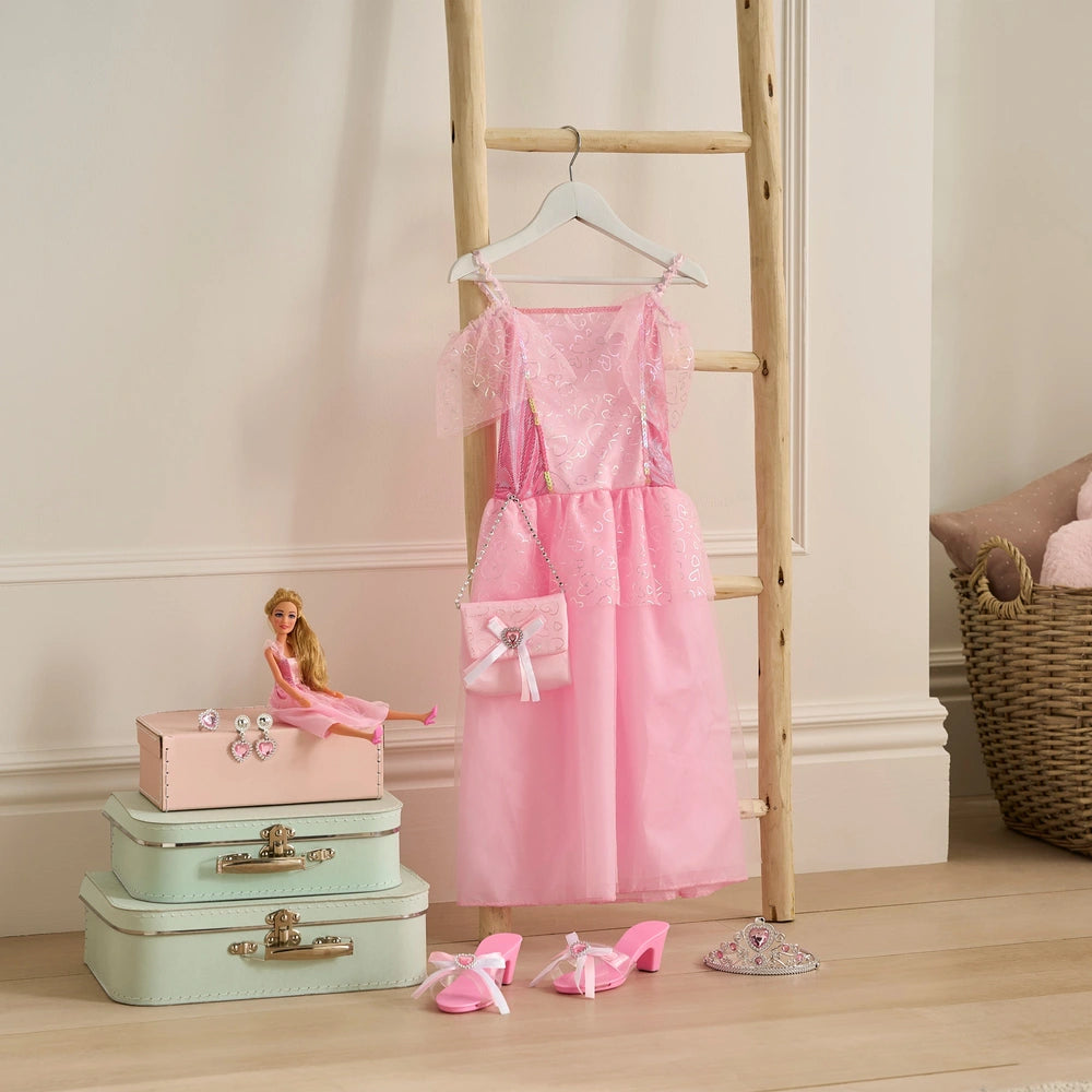 Dressing up is so much fun with this complete princess dress up playset. The set includes Princess Dress, Tiara, Earrings, Ring, Bag, Princess Play Shoes, a doll and doll dress. The toy play shoes are designed for dress up role play only, and are not suitable for outdoor hard surface wear.